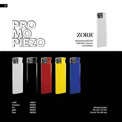 10 PRO MO PIEZO Verpackung 50 Stk. 1.000 Stk. / Karton nachfüllbar weiß 68251 schwarz 68252 rot 68253 gelb 68254 blau 68255 Abmessungen 24 x 81 x 10 mm Druck: 15 x 55 mm