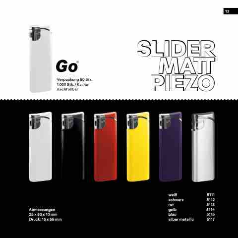 SLIDER Verpackung 50 Stk. 1.000 Stk. / Karton nachfüllbar MATT PIEZO 13 Abmessungen 25 x 80 x 10 mm Druck: 15 x 55 mm weiß 5111 schwarz 5112 rot 5113 gelb 5114 blau 5115 silber metallic 5117