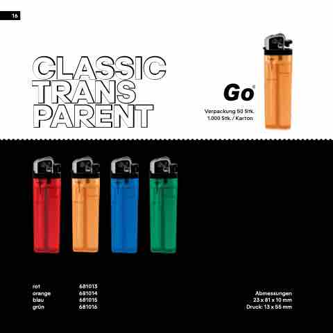 16 CLASSIC TRANS PARENT Verpackung 50 Stk. 1.000 Stk. / Karton rot 681013 orange 681014 blau 681015 grĂ¼n 681016 Abmessungen 23 x 81 x 10 mm Druck: 13 x 55 mm
