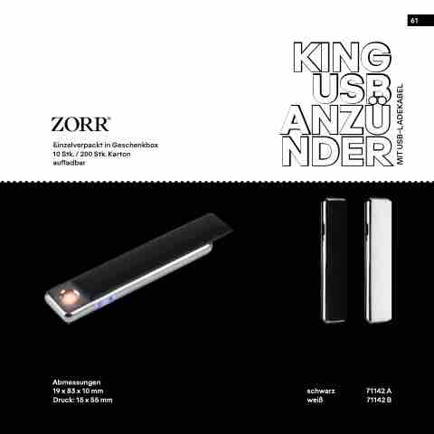Einzelverpackt in Geschenkbox 10 Stk. / 200 Stk. Karton aufladbar KING USB ANZÜ NDER 61 Abmessungen 19 x 83 x 10 mm schwarz 71142 A Druck: 15 x 55 mm weiß 71142 B MIT USB-LADEKABEL