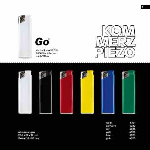 Verpackung 50 Stk. 1.000 Stk. / Karton nachfüllbar KOM MERZ PIEZO 7 Abmessungen 25,5 x 80 x 10 mm Druck: 15 x 55 mm weiß 6321 schwarz 6322 rot 6323 gelb 6324 blau 6325 grün 6326